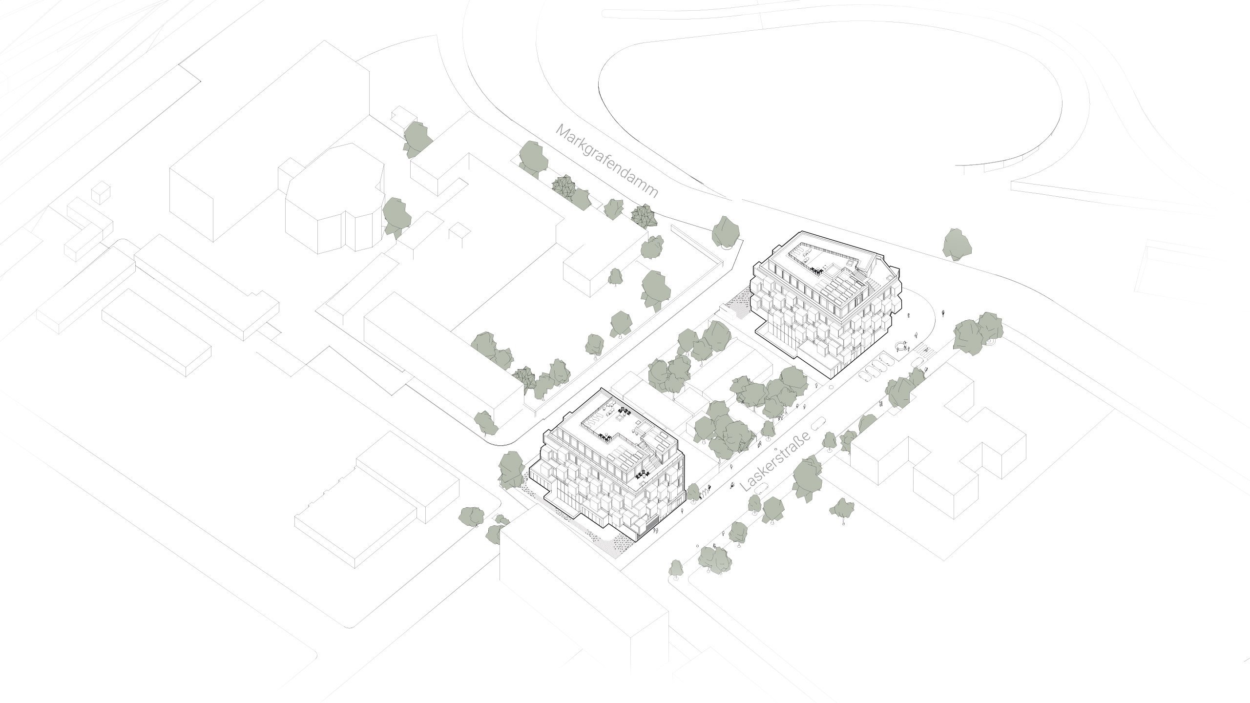 Die Gebäude von A LASKA signalisieren bereits von weitem die Dynamik einer neuen Ära des Arbeitens. Die markante Fassade wirkt wie gestapelte, gegeneinander verschobene Container mit prominenten Erkern. Aus der Nähe scheinen die Gebäudeecken miteinander verzahnt und erlauben die Verschmelzung von Arbeits- und Lebensraum. So entstehen im Inneren ganz unterschiedliche Räume und Kommunikationsbereiche, die widerspiegeln, was die heutige Arbeitswelt auszeichnet: Vielfalt. Die Möglichkeiten der beiden Gebäude sind so vielfältig wie die Menschen, die hier zusammenkommen.